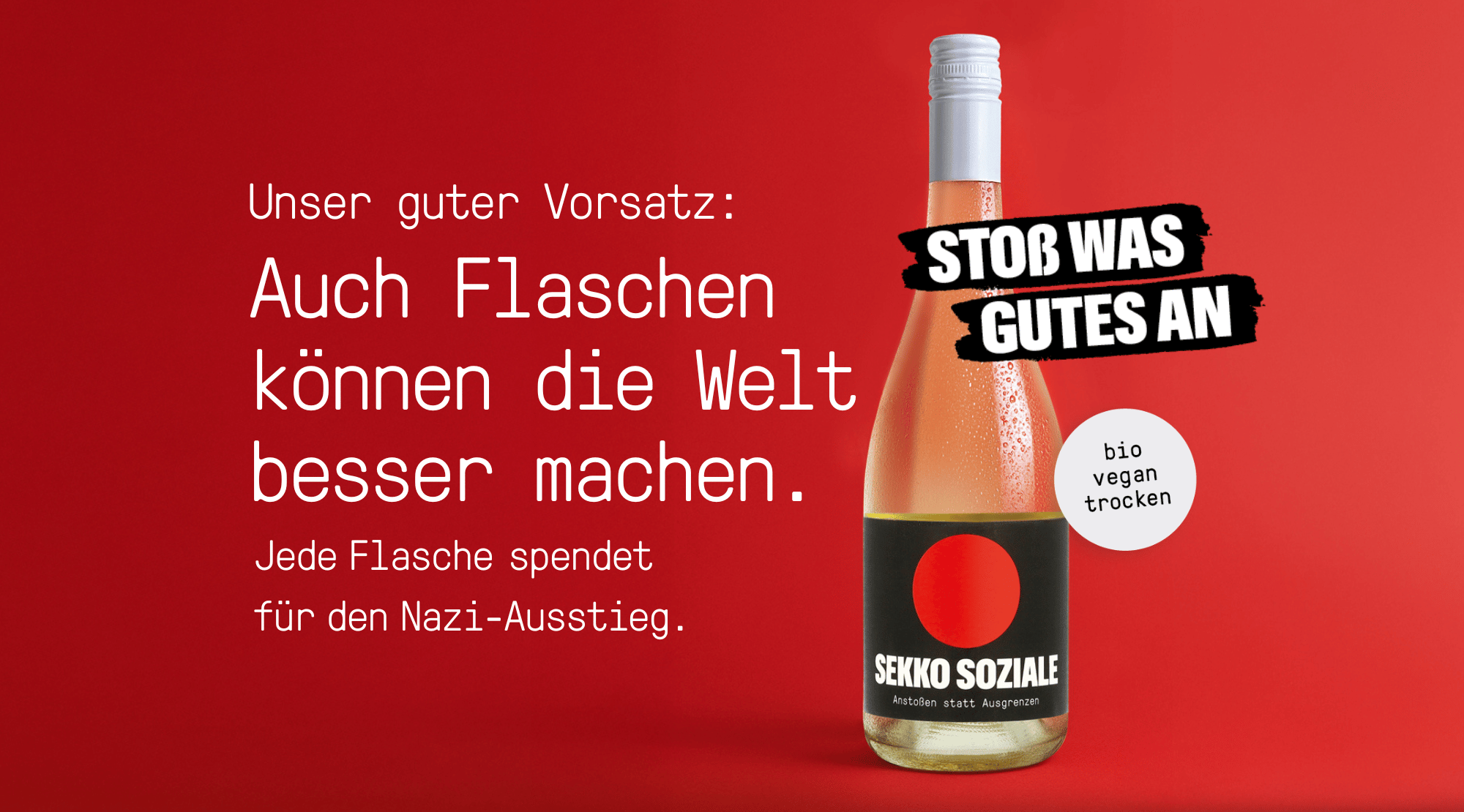Du trinkst besten Sekko – wir sorgen mit dafür, dass Rechtsextreme den Ausstieg aus der Szene schaffen. Bis heute haben wir dafür mehr als 68.000 Euro an Spenden generiert. Für eine offene Gesellschaft und eine Welt ohne Faschismus. Erfahre mehr über unser Spendenziel.